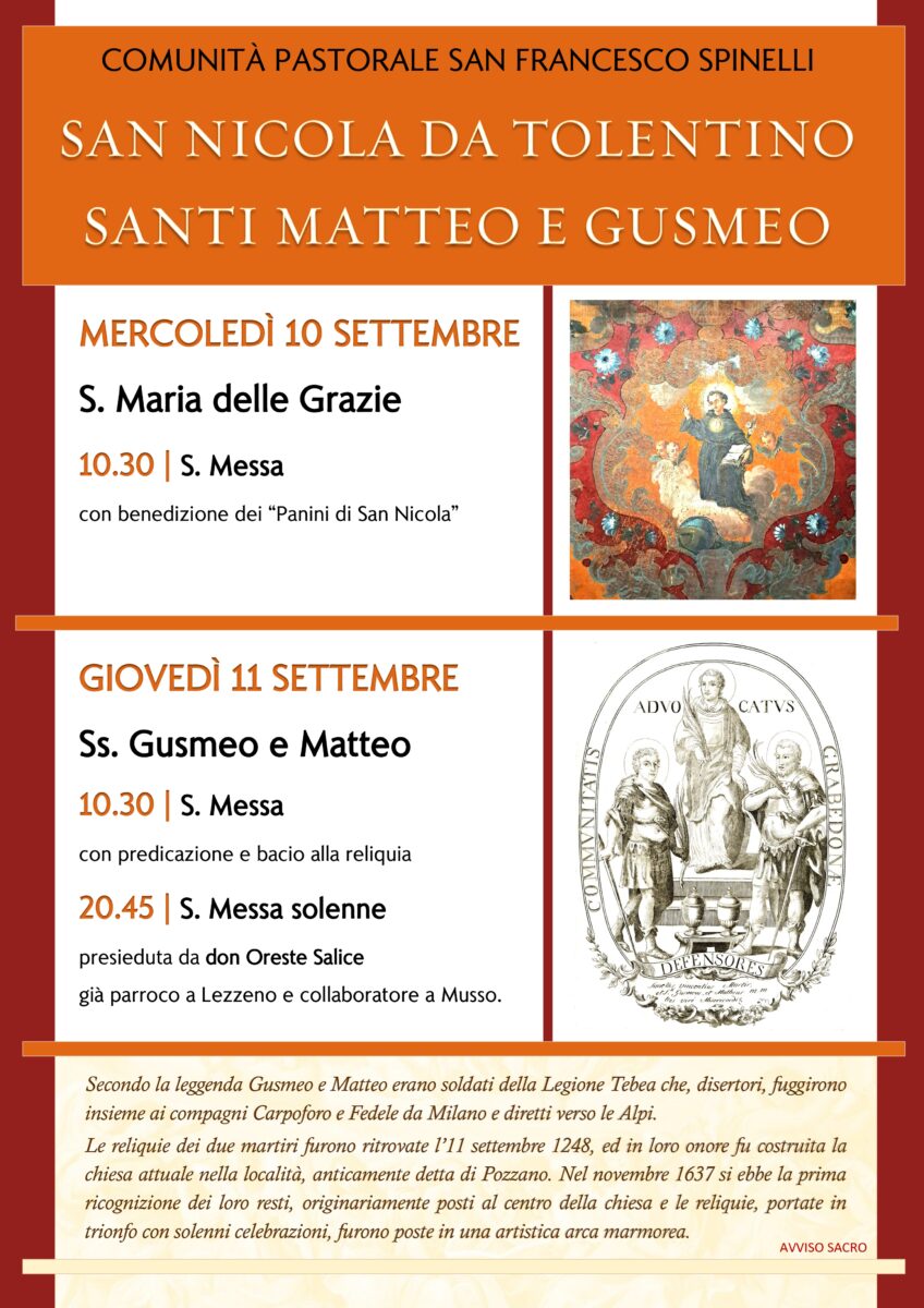 A Gravedona tra il 10 e l’11 settembre si vive la festa di San Nicola da Tolentino al Convento (chiesa di Santa Maria delle Grazie) e quella dei santi Martiri Gusmeo e Matteo, presso la loro chiesa.