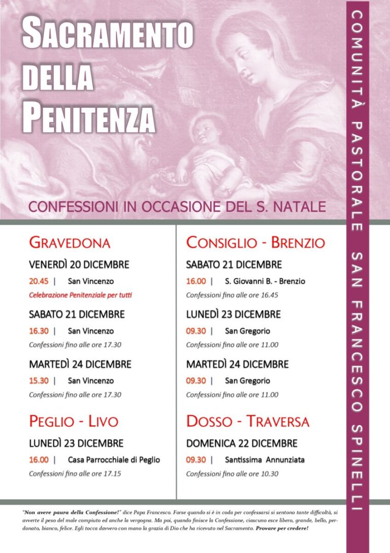 Numerose sono le occasioni per avvicinarsi al Sacramento della Penitenza, in tutte le parrocchie della nostra Comunità Pastorale, in preparazione al S. Natale.Riportiamo gli orari…