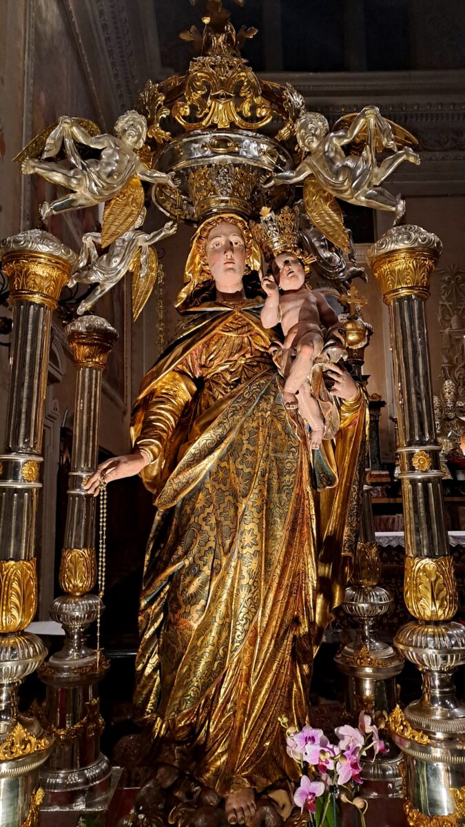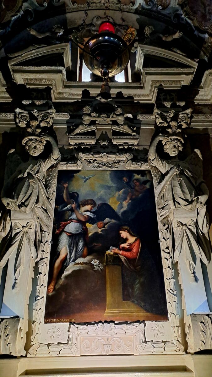 Di fronte, la cappella del Rosario mostra una bella statua lignea della Madonna col Bimbo entro una nicchia, mentre la cappella a fianco dell’ingresso laterale, dedicata all’Annunciata, ha una tela con l’Annunciazione esemplificata sul riconoscibile modello tizianesco. È opera tarda del trapanese Andrea Carrera, cui fu commissionata da Antonio Moraschino, uno dei tanti emigrati da Livo in Sicilia e fondatore di un legato per la celebrazione di una messa quotidiana, il cui adempimento ebbe inizio nel 1674. Ricordano l’emigrazione, sul lato sinistro della cappella, un dipinto votivo raffigurante la statua marmorea della Madonna di Trapani con l’offerente Antonio Barraia, e, sul lato destro, la sorridente Madonna di Bel vedere del messinese Lorenzo Timponello .