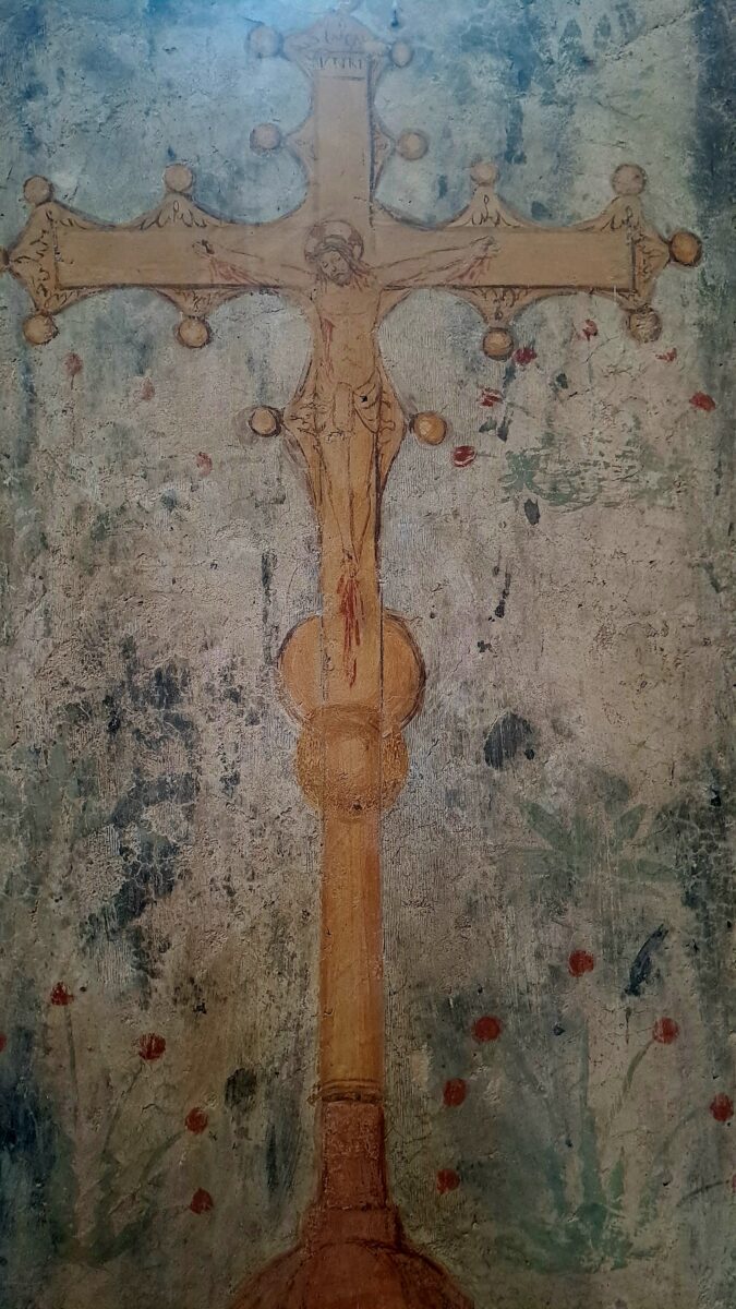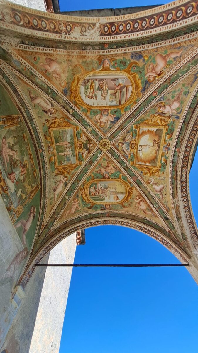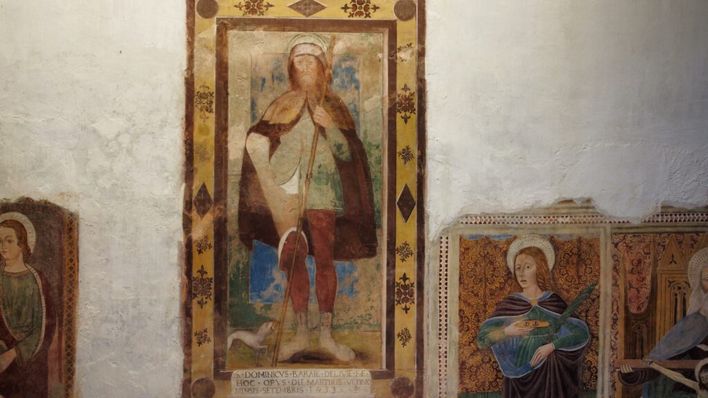 Nel terzo comparto è rappresentato, secondo un’iconografia ricorrente nelle stampe nordiche, San Giovanni con la coppa velenosa, con la quale, secondo la tradizione, si era attentato alla sua vita. Il San Rocco, al centro della parete sopra la porta laterale, fu commissionato da Domenico Barraia nel 1533, mentre non hanno data né committente la Santa Lucia e la Trinità dipinti entro una comune cornice e sullo sfondo di drappi damascati, raffigurazioni fortemente arcaiche. La Vergine col Bambino è della metà del Cinquecento, più tardi i Santi Cosma e Damiano. Sul successivo pilastro troviamo affreschi votivi mariani, e un San Giobbe col corpo butterato del 1523. Nella parte superiore dell’ultimo comparto vi è una teoria di Vergine e Santi, come pure sul comparto di fronte. Sul pilastro dell’arco presbiteriale un Battesimo di Cristo della fine del Quattrocento sormonta un tabernacolo scolpito in pietra. Sulla facciata esterna del pilastro è affrescato S. Giacomo, mentre sul corrispondente pilastro di destra è dipinto San Leonardo. A destra occupa il terzo camparto la cappellina di S. Rocco, che è affrescata con Storie del Santo ai lati di una nicchia contenente una statua lignea della Madonna col Bambino, la Vergine in gloria tra san Rocco e santa Caterina nel catino absidale e l’Annunciazione con Dio Padre sopra l’arco d’ingresso.