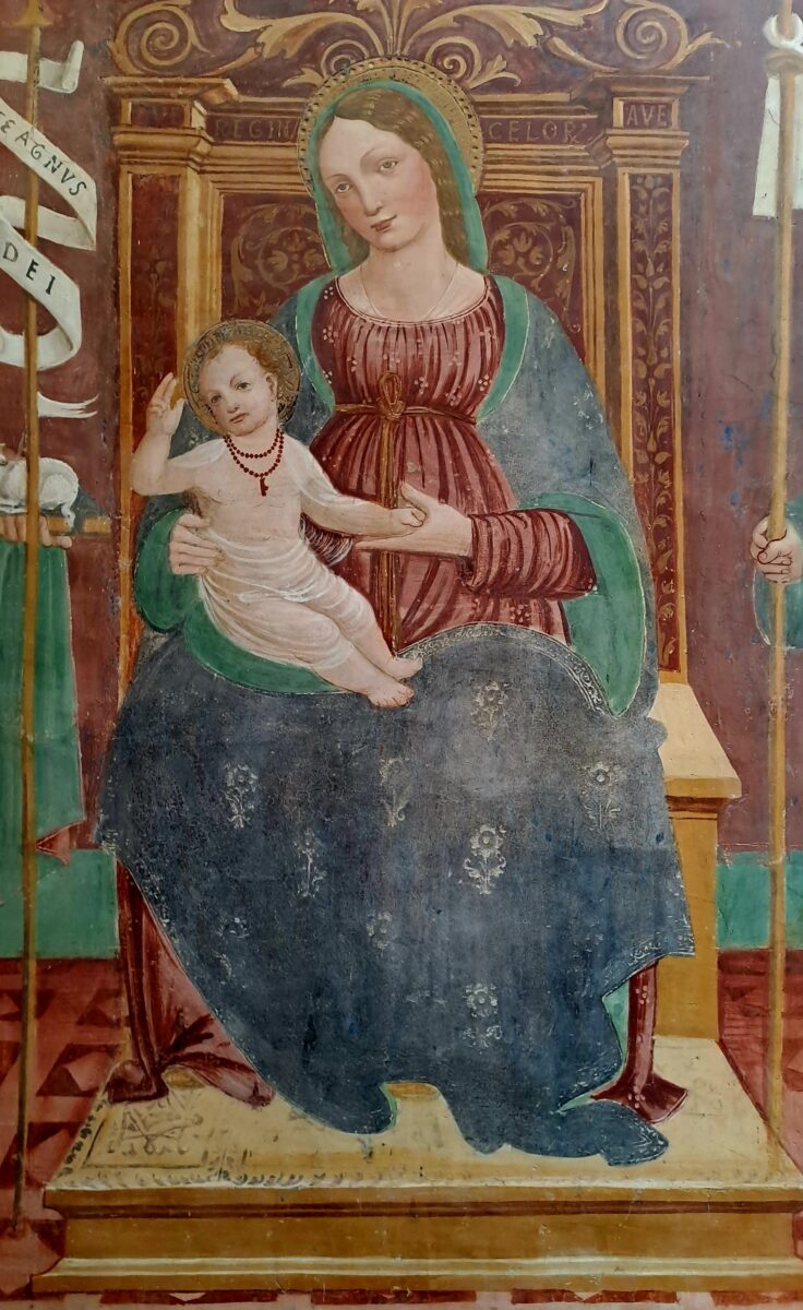 Sulla controfacciata è rappresentata la Vergine tra San Bernardo e Sant’Antonio, datata 1544 e commissionata da Antonio Adamo e due altri livesi. Il trono su cui è assisa Maria col Bimbo in braccio adorno di bracciale e collana in corallo, con evidente riferimento al sangue di Cristo, è interpretato in modo naturalistico secondo una peculiarità diffusa nel Cinquecento padano. Il disordinato ciclo di affreschi della chiesa, di cui molti recano il nome del committente, a volte uno per ogni sacro personaggio per limitare i costi, è uno dei più vasti e interessanti dell’Alto Lago.