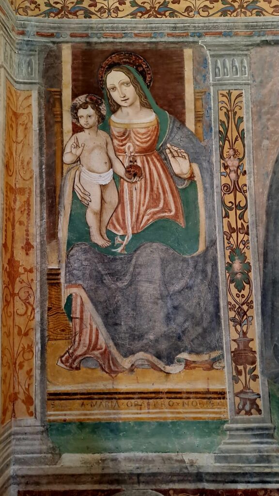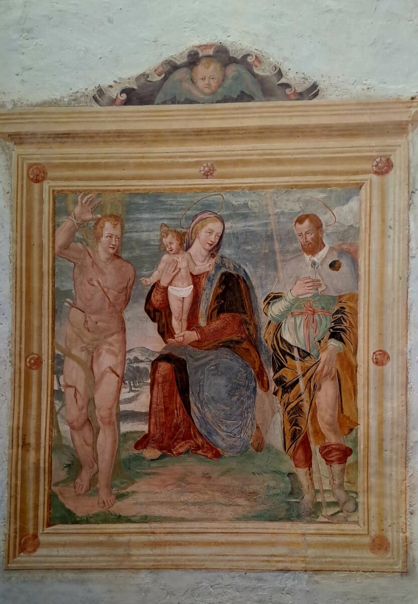 Nel secondo comparto è dipinto un finto altare con due trittici: il primo raffigura la Madonna tra San Giacomo e Sant’Antonio, il secondo la Madonna tra San Giacomo e San Sebastiano, il santo popolare invocato contro la peste. Gli affreschi risentono dell’influenza di Giovanni Andrea De Magistris, mentre piuttosto grezza è la Madonna datata 1511 sul pilastro tra secondo e terzo comparto.