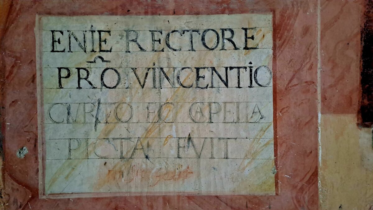 Sul fronte dell’arcone d’ingresso sono dipinti, al centro, Dio Padre in una gloria angelica e, sopra i pilastri, l’Angelo annunciante e l’Annunciata, nell’emiciclo I dodici Apostoli, nella fascia superiore con decorazione a grottesche cinque medaglioni con San Vincenzo al centro e, ai suoi lati, i Dottori della Chiesa e nel catino absidale Cristo in gloria tra gli Evangelisti con i loro attributi. Nella fascia inferiore la decorazione è a motivi geometrici mentre è a motivi floreali negli oculi, nelle finestrelle e nel sottarco.
