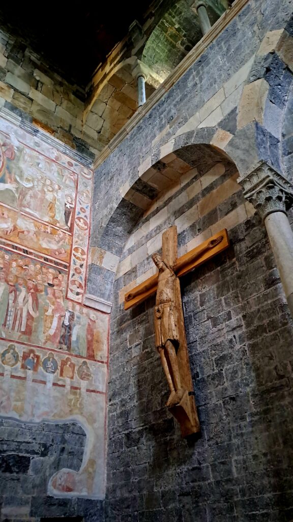 2. Crocifisso ligneo. Scultura in legno di pioppo ed ontano di scuola renana (probabile prima metà del XII sec., già nell’antica S. Vincenzo), qui trasportato nel ‘600, e restaurato nel 2000. Si tratta di un Cristo trionfante, che mostra il crocifisso vivo, con la figura intera dritta, in posa statica, con la testa non reclinata, gli occhi ben aperti e con l’espressione impassibile non sofferente. Si tratta di uno dei più antichi crocifissi dell’intera diocesi di Como.