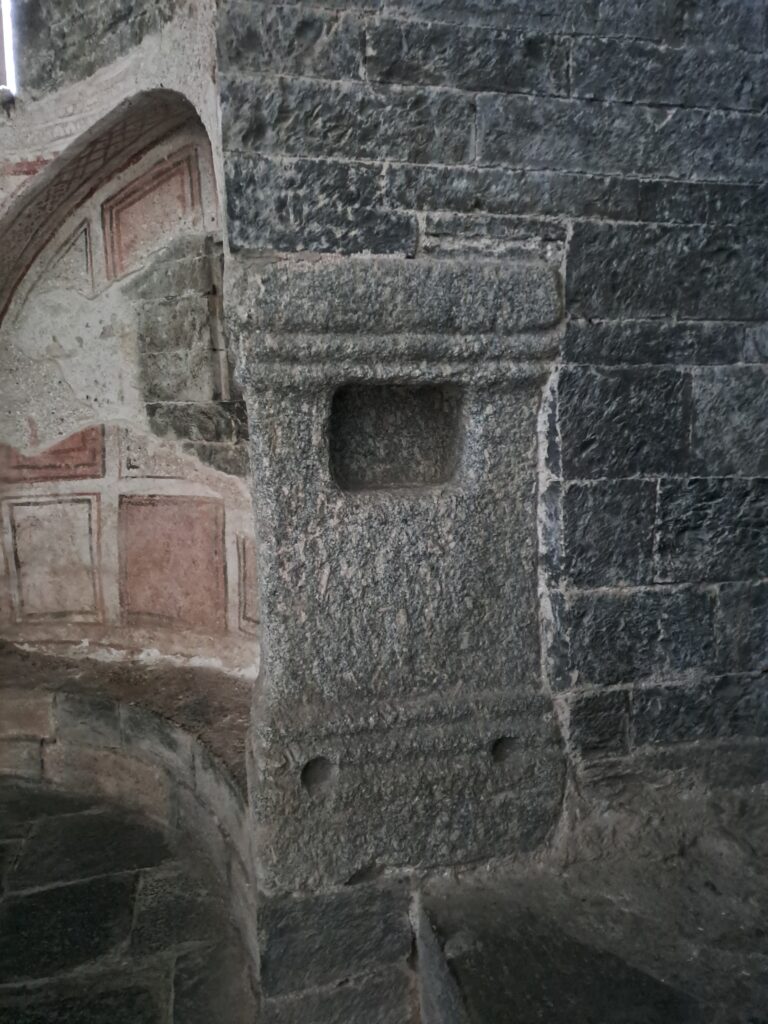 7. Natività. Ormaia quasi invisibile, è un affresco devozionale che richiama l’immagine che brillò nell’anno 823. Queste tracce ci lasciano ipotizzare che tutto il Battistero fosse un tempo affrescato.