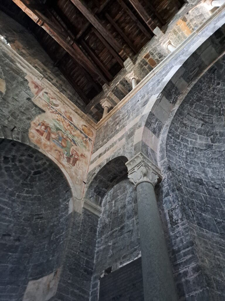 3. Lacerti di affreschi devozionali. Di artista anonimo (II metà del XIV sec.) furono riscoperti nel 1953, dopo la demolizione dell’altare seicentesco dedicato alla Madonna del Carmelo. In basso da sinistra, Sant’Anna “metterza” che tiene in braccio la Vergine Maria con in grembo il bambino Gesù. Al centro Santa Susanna, giovanissima martire romana del IV secolo.